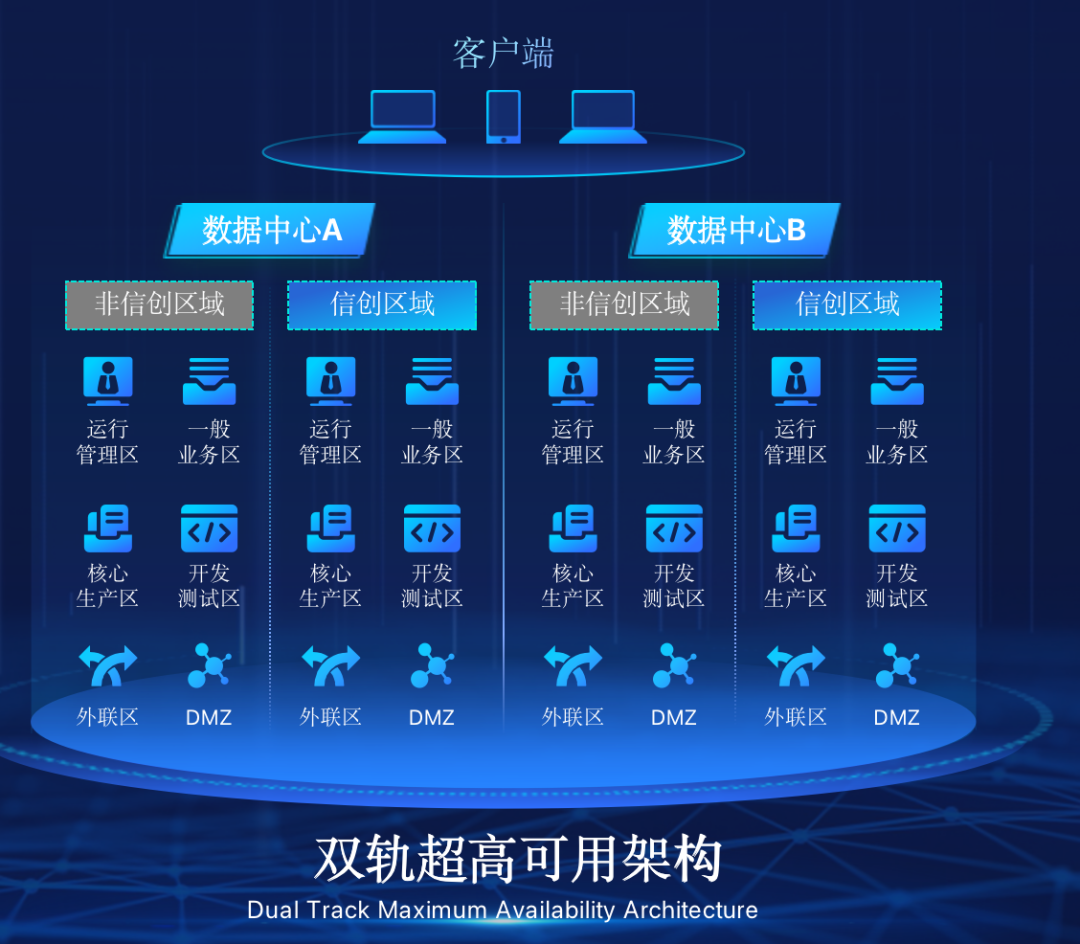 Ebpay在企业面临自主创新IT基础重构过程中,推出的全新架构双轨超高可用架构(简称DTMAA),在双活数据中心的分区调度基础上,添加每个数据中心内信创域和非信创域的分域调度,来实现分区分域协同的多活双轨超高可用。